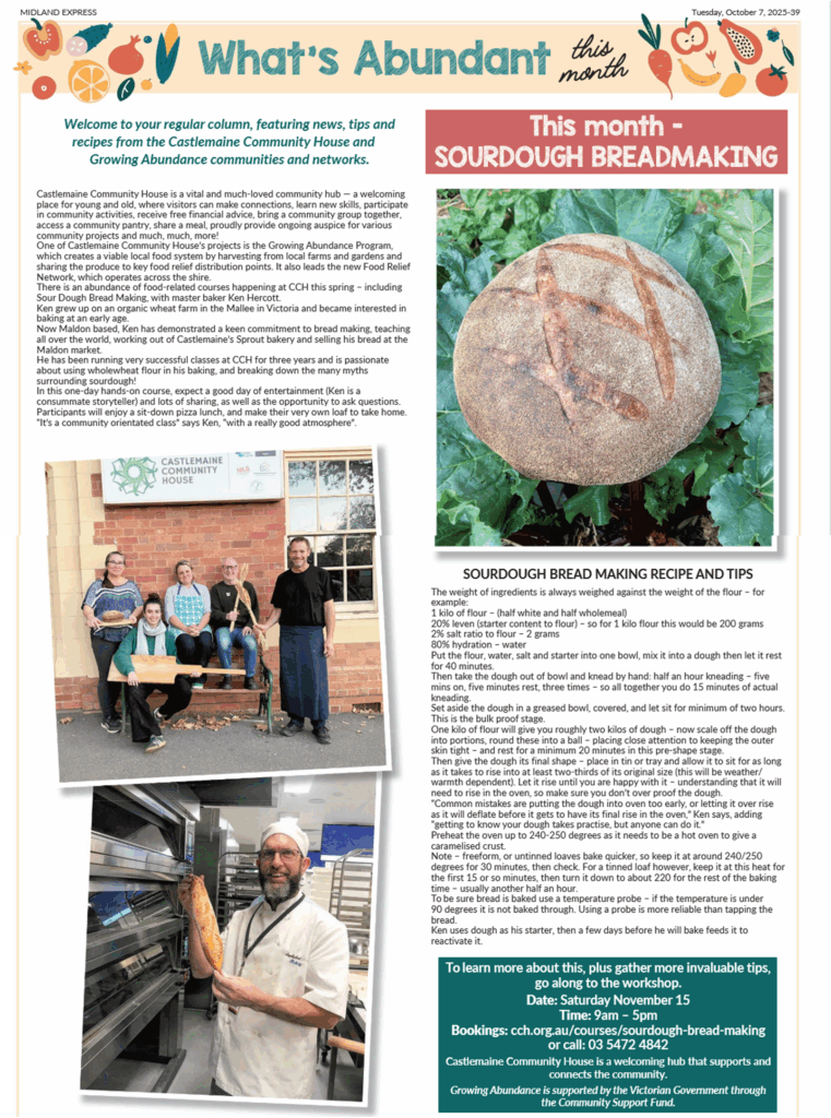 Castlemaine Community House has a bunch of food related courses and workshops on this term, including Sour Dough Bread Making with master baker Ken Hercott. For bookings: https://cch.org.au/courses/sourdough-bread-making/